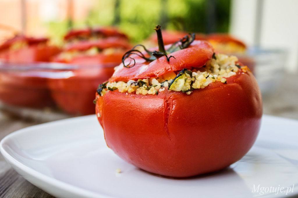 Z pomidorów odkroić kapelusze i wydrążyć miąższ. Pomidory lekko natrzeć w środku oliwą i oprószyć przyprawami (papryka słodka i ostra). Kaszę kuskus przygotować według wskazówek na opakowaniu. Gotową kaszę wymieszać z miąższem z pomidorów, marchewką z groszkiem, przyprawami (curry, zioła) oraz sosem sojowym. Tak przygotowanym farszem nadziewać pomidory. Całość zapiekać w piekarniku w żaroodpornym naczyniu przez 20 minut w temperaturze około 170 stopni.